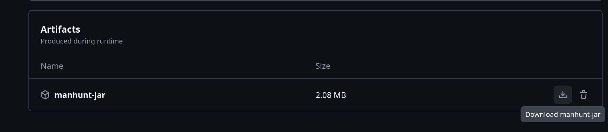 Alternatively, if you want to test the latest development version of the plugin (which may be unstable and buggy), go to the [GitHub Actions page](https://github.com/Radialbog9/MinecraftManhunt/actions/workflows/maven.yml). Click on the top (latest) build then scroll down to artifacts and download the `manhunt-jar`zip file.